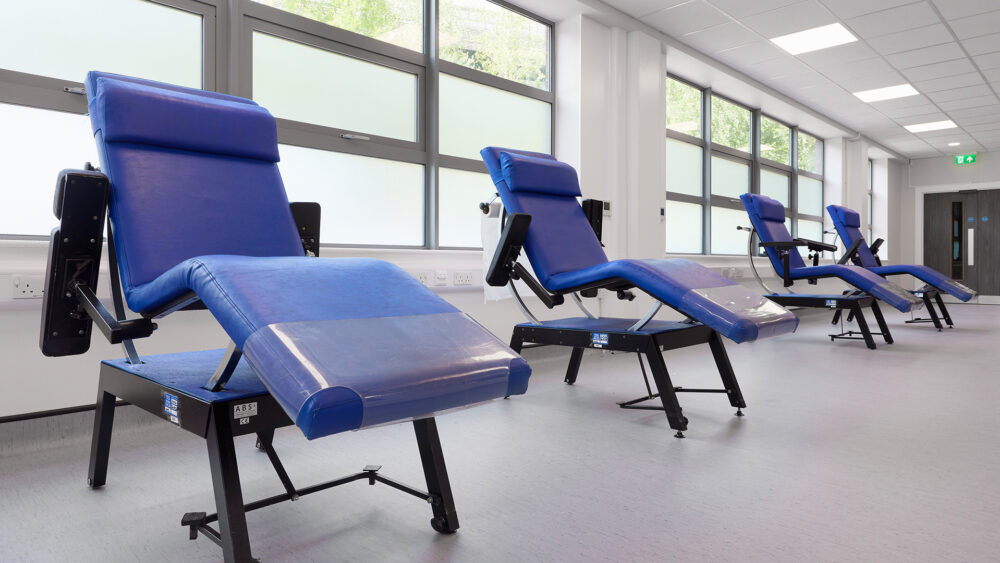 In addition to nine donation beds and individual consultation rooms, a new kitchen, waiting area and an environmentally controlled storage unit have been created, with existing mechanical and engineering (M&E) elements stripped out and replaced to healthcare standards.